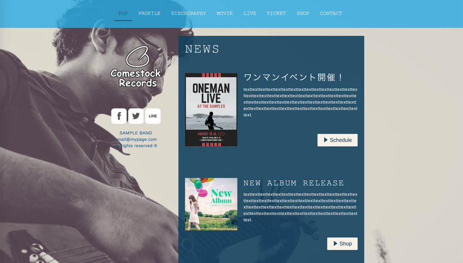 - また、TOPページ下部にはLIVE情報やSNSなどのトピックを集約しているので、活動が活発で更新頻度の高いバンドにもおすすめのレイアウトです。